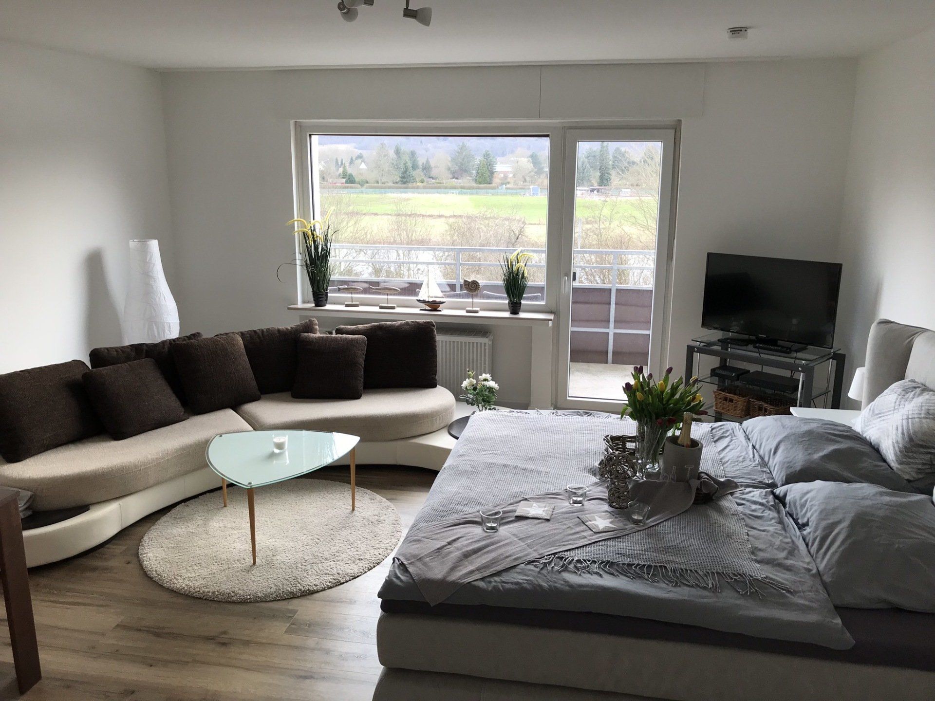 Weserblick: Unser Appartement mit Südbalkon, und Blick auf die Weser. Hier haben Sie im 1-Raum Appartement mit Pantryküche genügend Platz und Raum um sich wohl zu fühlen.